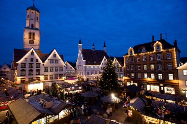 Der Marktplatz der oberschwäbischen Stadt Biberach an der Riß mit seinen prächtigen Patrizierhäusern ist Schauplatz für den Biberacher Christkindles-Markt. Auch die hell angestrahlte Stadtpfarrkirche St. Martin sorgt für weihnachtliche Atmosphäre. An über 60 festlich geschmückten Weihnachtshütten können die Besucher weihnachtliche Waren, Geschenkartikel und kulinarische Spezialitäten erwerben. Unbedingt probieren sollte man die Biberacher Springerle, einem traditionellen Anis-Weihnachtsplätzchen aus Eierschaumteig. Auf dem Christkindlesmarkt kann man das Holzmodel mit dem Biberacher Weihnachtsmotiv kaufen, um die Plätzchen nachzubacken. Örtliche Vereine und Kindergruppen gestalten auf der Weihnachtsmarktbühne ein abwechslungsreiches Programm zum Christkindles-Markt in Biberach an der Riß. Jeden Mittwoch von 14 bis 17.30 Uhr erhalten die kleinen Besucher beim Kindernachmittag Leckereien und Karussellfahrten zu Taschengeldpreisen. Am 5. Dezember dürfen sich die Kinder auf den Besuch vom Nikolaus freuen. (© FuM)