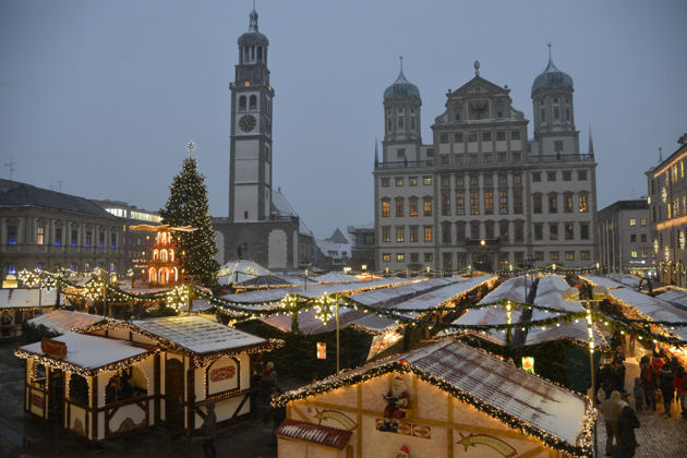 In diesem Jahr werden zum Christkindlesmarkt in Augsburg wieder viele Besucher aus Nah und Fern erwartet. Der Weihnachtsmarkt erstreckt sich vom Rathausplatz über den Martin-Luther Platz entlang der Philippine Welserstraße und Maximilianstraße bis zur Moritzkirche. Das reichhaltige Angebot an weihnachtlichen und Kunstgewerbeartikeln lädt zum Bummeln und Shoppen ein. Der ein oder andere kann hier sicher noch die letzten Geschenke einkaufen. Bewundern Sie das traditionelle Engelsspiel, nach dem Vorbild von Hans Holbeins berühmten Altarengeln. Die Vorführung findet vor der Kulisse des historischen Rathauses an allen Adventswochenenden von Freitag bis Sonntag um 18 Uhr statt. Besucher lassen sich durch ein weihnachtliches Rahmenprogramm mit den Domsingknaben, Augsburger Schulchören und Volksliedersingen in festliche Stimmung versetzen und genießen das einmalige Flair des Augsburger Christkindlesmarktes. Der Kinderweihnachtsmarkt am Moritzplatz präsentiert ebenfalls ein umfangreiches Rahmenprogramm. (© FuM)