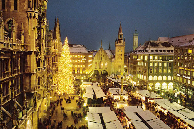 Weit über die Grenzen Münchens hinaus bekannt ist der traditionelle Christkindlmarkt rund um den Marienplatz. Der Christbaum am Marienplatz mit rund 2.500 Lichtern ist ein echtes Wahrzeichen des Marktes. Kulinarische Köstlichkeiten und die Angebote der zahlreichen Händler laden die Besucher zum Bummeln und Verweilen ein. Sonntags bis donnerstags um 17:30 Uhr dürfen sich die Besucher auf ein Musikprogramm vom Rathausbalkon freuen. Bei einem Glas Glühwein und der weihnachtlichen Musik können die Weihnachtsmarktgäste ganz entspannt das Marktgeschehen beobachten. Einer der Höhepunkte ist der alljährliche Krampuslauf über den Münchner Christkindlmarkt (07.12.2025). Weitere Besonderheiten, wie die Krippenausstellung mit über 100 Krippen, der Besuch des Nikolauses, die Auftritte des Kasperls an den Sonntagen sowie das Singen unterm Christbaum an den Donnerstagen runden den Christkindlmarkt am Marienplatz ab. (© FuM)