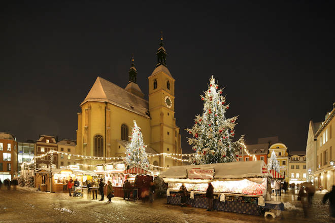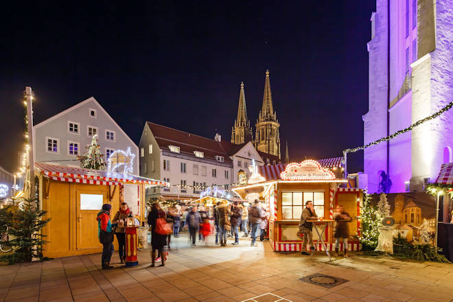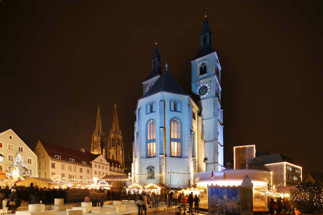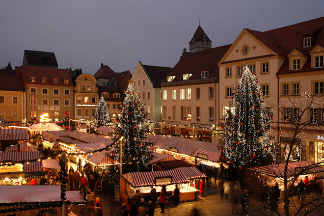 Der Christkindlmarkt in Regensburg erstrahlt wieder im weihnachtlichen Lichterglanz. Der Weihnachtsmarkt hat eine Jahrhunderte alte Tradition auf dem Neupfarrplatz. Zahlreiche Künstler wie Töpfer, Glasbläser, Kerzenzieher, Schnitzer und viele mehr zeigen den Besuchern ihr handwerkliches Können und bieten ihre Waren zum Kauf an. Kulinarische Köstlichkeiten, wie Heidelbeerglühwein aus dem bayerischen Wald, Apfelglühwein von Oberpfälzer Streuobstwiesen oder die Orginal Regensburger Bratwurst haben großen Anklang. Natürlich gibt es auch die gebrannten Mandeln, geröstete Maroni und viele andere süße Leckereien. Ein tägliches Bühnenprogramm mit Aufführungen der Regensburger Domspatzen, Musikschulen, Posaunenchöre runden den Christkindlmarkt in Regensburg ab. Die kleinen Besucher können sich auf die festlich geschmückten Kinderfahrgeschäfte sowie auf den Nikolaus freuen, der jeden Mittwoch zu Besuch kommt und Süßigkeiten verteilt. (© FuM)