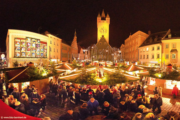 Der Straubiger Christkindlmarkt zu Füßen des gotischen Stadtturms lädt auch in diesem Jahr zu einem Bummel ein. Mehr als 30 Aussteller bieten handwerkliche Kostbarkeiten, Weihnachtsschmuck und allerlei kulinarische Spezialitäten an. Verschiedene Konzerte stimmen auf die staade Zeit ein. Und auch der Theresienplatz verbreitet festlichen Glanz. Fest mit dem Christkindlmarkt verbunden findet vom 1. bis 24. Dezember wieder der Straubinger Adventskalender statt. Hinter jedem der Fenster an der Fassade der Einhorn Apotheke verbergen sich insgesamt über 90 Preise. (© FuM)