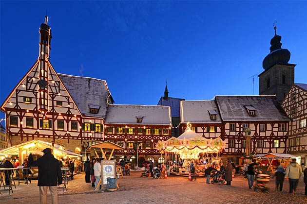 Eine der schönsten vorweihnachtlichen Attraktionen hat die Stadt Forchheim zu bieten. Hier finden die Besucher den wohl schönsten Adventskalender der Welt. Das Rathaus Ensemble mit seinen mittelalterlichen Fachwerkhäusern bietet zudem den festlichen Hintergrund für einen kleinen aber sehenswerten Weihnachtsmarkt. Zu Füßen des übergroßen Adventskalenders sind die geschmückten Verkaufsbuden aufgebaut und die Händler buhlen um die Gunst der zahlreichen Besucher. Auf dem Rathausplatz duftet es nach Glühwein, gebrannten Mandeln, aber auch andere kulinarische Köstlichkeiten wie Feuerzangenbowle und Glühbier. Auch ungarische und französische Spezialitäten verwöhnen die Besucher. Angeboten werden Weihnachtsdekorationen wie Christbaumschmuck, Süßwaren und Spielzeug sowie eine Vielzahl an Weihnachtsgeschenken. Höhepunkte sind die Adventskalenderöffnung durch den Forchheimer Weihnachtsengel um 18.30 Uhr, Kutschfahrten, Eisenbahnausstellung, Nostalgie-Karussell sowie eine lebende Krippe. Besonders sehenswert ist die "Fuchsenkrippe"- eine mechanische fränkische Krippe, welche vom ersten Advent bis in den Januar hinein zu bewundern ist. Der Weihnachtsmarkt in Forchheim beginnt jedoch immer am ersten Adventssamstag. (© FuM)