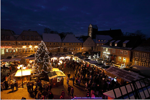 Der Gänsemarkt in Angermünde ist ein "gans" besonderer Weihnachtsmarkt. Lichterketten schmücken den kleinen Marktplatz der denkmalgeschützten Altstadt von Angermünde. Unter der Weihnachtstanne schnattern nicht nur die Gänse. sondern es erklingen auch Weihnachtslieder. Der Gänsemarktrundgang wird von einem weihnachtlichen Bühnenprogramm begleitet. Beim Gänsepapa gibt es Gänse - frisch, gefroren und auf Vorbestellung. Auch andere Spezialitäten vom Bauernhof und regionalen Produzenten aus der Uckermark werden angeboten. Neben knusprigen Gänsekeulen können die Besucher auf dem Gänsemarkt auch Wildspezialitäten genießen. Der Weihnachtsmann trifft am Sonntagnachmittag auf dem Bahnhof ein. Alle Kinder sind herzlich eingeladen ihn bis zum Angermünder Gänsemarkt zu begleiten. Ein ganz persönliches Geschenk dürften wieder die Familienfotos mit dem Weihnachtsmann werden, welche die "Weihnachtsmann & Co. KG" anbietet. Fazit: auf dem Gänsemarkt in Angermünde ist wieder "gans" viel los. (© FuM)