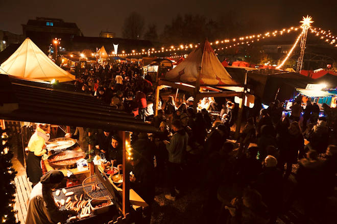 Die "Historische Weihnacht" auf dem RAW-Gelände in der Revaler Straße in Berlin-Friedrichshain findet 2025 bereits zum 9. Mal statt. Dabei handelt es sich um einen mittelalterlichen Weihnachtsmarkt mit Handel, Handwerk, abwechslungsreicher Gastronomie und Unterhaltung. Fackeln und Feuerstellen sorgen für eine gemütliche Atmosphäre. Töpfer, Schmiede, Holzschnitzer und weitere Handwerker bieten ihre Waren feil. An den Tavernen werden heißer Met, Glühwein und Feuerzangenbowle ausgeschenkt. Süße und deftige Speisen verwöhnen den Gaumen der Besucher. Gaukler und Akrobaten sowie Feuershows sorgen für die richtige Unterhaltung bei der "Historischen Weihnacht" in Berlin-Friedrichshain. Die Kinder dürfen sich auf das handbetriebene Holzriesenrad freuen. Außerdem kann man sich am Bogenschießen sowie Armbrustschießen versuchen. (© FuM)
