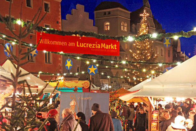 Eine weihnachtliche Atmosphäre erleben die Besucher wieder auf dem Lucrezia Weihnachtsmarkt der Kunsthandwerker in Regensburg. Einer alten Tradition folgend wurde der Weihnachtsmarkt auf dem Kohlenmarkt und Haidplatz, Lucrezia-Markt benannt. Kunsthandwerker verschiedenster Gewerke zeigen hier ihr Können und stellen ihre Exponate aus, die natürlich auch käuflich erworben werden können. So mancher findet hier noch die letzten Geschenke für das bevorstehende Weihnachtsfest. Die künstlerisch gestalteten Geschenkideen reichen von bunt bemalter Keramik über verschiedenen Seifen und Parfüms bis zu Gold und Silberschmiedearbeiten. Für das leibliche Wohl ist natürlich bestens gesorgt. Ein abwechslungsreiches Kulturprogramm auf zwei Bühnen sowie eine Kunstausstellung direkt am Haidplatz runden den Lucrezia Weihnachtsmarkt der Kunsthandwerker in Regensburg ab. Immer vom Freitag vor dem 1. Advent bis zum 23. Dezember findet der Lucrezia Weihnachtsmarkt der Kunsthandwerker in Regensburg statt. (© FuM)