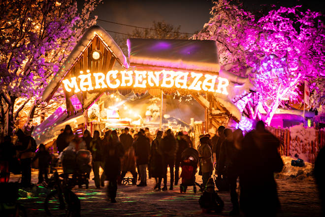 Der Märchenbazar Weihnachtsmarkt im Olympiapark Süd in München zählt zu den etwas ausgefalleneren Weihnachtsmärkten der bayerischen Landeshauptstadt. Nostalgische Jahrmarktsbauten und selbstgezimmerte Verkaufsbuden bestimmen das Bild. An etwa 40 Ständen wird den Besuchern ein breites kulinarisches Angebot von exotischem indischen Essen über selbstgemachten Falafel mit Hummus bis hin zur klassischen Bratwurst unterbreitet. In den nostalgischen Zirkuszelten bieten Künstler und Handwerker Geschenkartikel wie selbstgemachte Lederwaren, Kunst aus Kenia oder Handschuhe und Mützen an. Abgerundet wird der Märchenbazar Weihnachtsmarkt durch tägliche Livemusik. Veranstalter, Zeltbetreiber und viele der Aussteller kommen aus dem Viertel und möchten mit dem Märchenbazar einen Weihnachtsmarkt fürs Viertel gestalten. (© FuM)