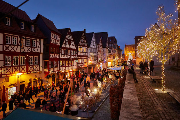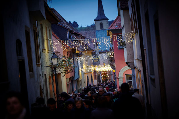 Das Adventsgässle in Ochsenfurt versteht sich als ein "etwas anderer Weihnachtsmarkt". Zum Adventsgässle verwandelt sich die Altstadt von Ochsenfurt in ein riesiges Lichtermeer. Vor dem Rathaus, in der Badgasse, der Spitalgasse sowie der Brückenstraße werden zahlreiche Stände aufgebaut. Hier verkaufen Kunsthandwerker genauso wie Vereine und Schulen weihnachtliche Waren - alles von den Anbietern selbst gestaltet und gefertigt. Für das leibliche Wohl gibt es Waffeln, Bratwurst sowie fränkischen Glühwein oder heißen Apfelmost. Nicht nur der Nikolaus und seine beiden Engel statten dem Adventsgässle in Ochsenfurt einen Besuch ab, man kann auch der Zuckerfee, der Ochsenfurter Symbolfigur, begegnen. Zum Rahmenprogramm zählen Musikdarbietungen genauso wie Theateraufführungen. (© FuM)