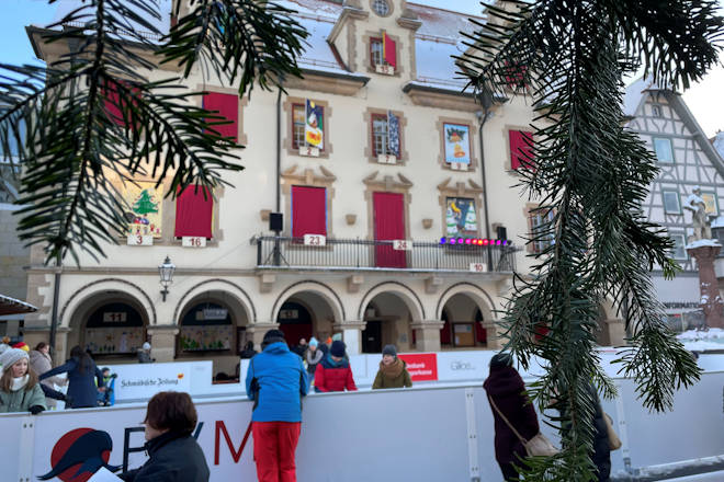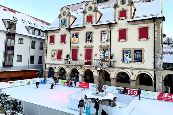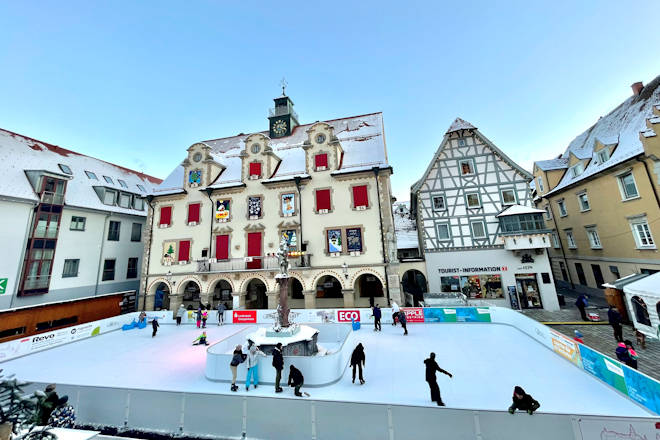 "SIG On Ice" ist ein unverzichtbares Highlight der Weihnachtszeit in der Stadt. Neben dem traditionellen Weihnachtsmarkt des SV Sigmaringen zieht dieses Event täglich zahlreiche Schlittschuhläufer auf den Marktplatz vor dem imposanten Rathaus der Stadt. Seit 2022 verfügt die Eisbahn über eine Synthetik-Lauffläche, die nicht nur das Schlittschuhlaufen angenehmer macht, sondern auch Energie spart. Doch "SIG On Ice", wie die Sigmaringer es liebevoll nennen, bietet weit mehr als nur Eislaufen. Die Besucher können sich auf ein vielfältiges gastronomisches Angebot freuen, das die winterliche Atmosphäre noch gemütlicher gestaltet. Ob heiße Getränke, leckere Snacks oder süße Leckereien, für jeden Geschmack ist etwas dabei. Die Schlittschuhbahn bleibt bis Anfang Januar aufgebaut, sodass Einheimische und Besucher aus der Region genügend Zeit haben, das Vergnügen des Eislaufens und die festliche Stimmung zu genießen. (© FuM)
