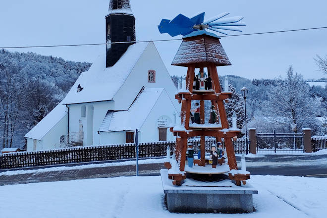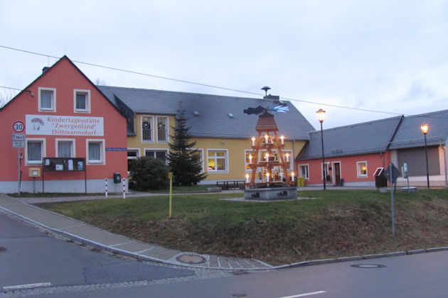Die Dittmannsdorfer machen aus dem traditionellen Pyramidenanschieben in Dittmannsdorf, einem Ortsteil der Gemeinde Gornau/Erzgeb. welcher liebevoll auch als "Klein Tirol" bezeichnet wird, inzwischen ein richtiges Pyramidenfest und das 2025 bereits zum 35. Mal. Die dreistöckige Pyramide wird durch einige engagierte Dittmannsdorfer, den "Pyramidenbauern" vor dem ersten Advent aufgestellt. Die Figuren selbst nehmen erst in den Vormittagsstunden des 1. Advents ihren Platz ein, um dann bis mindestens Hochneujahr ihre Runden zu drehen. Rund um das Anschieben der Dittmannsdorfer Pyramide am 1. Advent gibt es ein kleines Rahmenprogramm. 2025 steht das Pyramidenfest in Dittmannsdorf unter dem Motto "Mettenschichten". Sie verdeutlichen in einzigartiger Weise die tiefe Verbundenheit der Bergleute zum Glauben, welch zentrale Bedeutung er besonders zur Weihnachtszeit hatte und wie er über die Jahrhunderte die bergbaulichen Traditionen sowie das Brauchtum in unseren Gefilden prägte. Zum Programm gehören Grußworte vom Bürgermeister, musikalische Beiträge unter anderem vom Posaunenchor, Darbietungen von den Zwergenlandbewohnern und der humorvolle Jahresrückblick zweier Klein Tiroler Originale. Die Kinder dürfen sich auf den Besuch vom Weihnachtsmann, welcher mehr Autos als der Sandmann besitzen soll, freuen. Für das kulinarische Wohl ist zum Pyramidenanschieben in Dittmannsdorf gesorgt. Ein kleines Angebot regionaler Produkte rundet das Pyramidenfest in Dittmannsdorf ab. Das Pyramidenfest findet stets am 1. Advent statt. (© FuM)