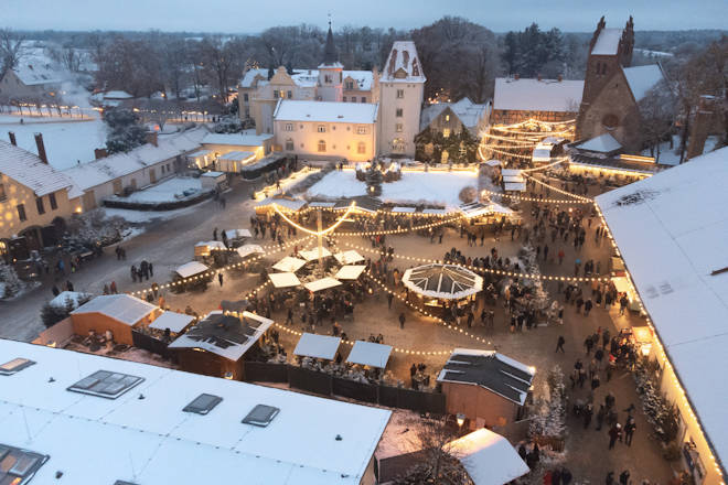 Auf Schloss & Gut Liebenberg im Löwenberger Land findet in diesem Jahr an allen vier Adventswochenenden der historische Weihnachtsmarkt statt. Lichterketten, Feuerstellen und mit Äpfel vom Gutshof geschmückte Tannen sorgen für ein festliches Ambiente. Angeboten werden Weihnachtsgeschenke sowie Handgemachtes aus der Region. Der Duft von gebrannten Mandeln und heißer Schokolade liegt in der Luft. Brandenburger Spezialitäten von süß bis deftig sorgen für das kulinarische Wohl der Besucher. (© FuM)