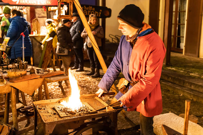 Die Treuchtlinger Schlossweihnacht hat sich seit vielen Jahren fest im Herzen der Stadt Treuchtlingen etabliert hat. An zwei besinnlichen Adventswochenenden verwandelt sich der Bereich vor dem imposanten Stadtschloss in eine festliche Oase der Vorfreude auf das Weihnachtsfest. Die Szenerie wird besonders zauberhaft, wenn die Dunkelheit einkehrt und das Stadtschloss in einem funkelnden Lichterglanz erstrahlt. Die Besucher können sich verführen lassen von den verlockenden Düften von Plätzchen, Lebkuchen und herzhaften Schmankerln. Und natürlich darf der Glühwein, in verschiedenen köstlichen Variationen, nicht fehlen. In den rustikalen Holzhütten entlang des Stadtschlosses können die Besucher nach traumhaften Kunsthandwerken aus Holz, Keramik und Strickwaren stöbern. Doch das Highlight der Treuchtlinger Schlossweihnacht ist zweifellos der historische Mittelaltermarkt im Schlosshof. Hier entführt der Duft von süßem Met, mittelalterlichem Gebäck und prasselnden Lagerfeuern die Besucher in eine andere Zeit, in der Ritter, Gaukler und Fabelwesen die Straßen bevölkerten. Das Rahmenprogramm ist ebenso beeindruckend: Feuerartistik, Glasbläserkunst und Märchenstunden im historischen Erkerzimmer des Stadtschlosses lassen die Herzen der Besucher höherschlagen. Kinder können sich beim Weihnachtsbasteln vergnügen, und der Maler und Grafiker Willi Halbritter gewährt faszinierende Einblicke in seine Druckwerkstatt im Blauen Haus des Museums. Während der Treuchtlinger Schlossweihnacht haben Besucher außerdem die Möglichkeit, die historischen Räume und Ausstellungen des Naturparks Altmühltal und des Geoparks Ries kostenfrei zu besichtigen. Und auch im Schloss selbst finden sich weitere talentierte Kunsthandwerker, die ihre Werke präsentieren. (© FuM)