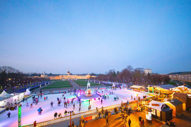Die Stadtwerke Karlsruhe WINTERZEIT verleihen dem historischen Schlossplatz eine zauberhafte Winteratmosphäre. Diese Veranstaltung bietet eine einzigartige Kombination aus winterlichen Aktivitäten und festlichem Flair. Das Herzstück ist zweifellos die große Eisfläche, auf der Schlittschuhläufer ihre Runden drehen können. Die Stock-Arena bietet eine unterhaltsame Gelegenheit für Freunde des Eisstockschießens. Unter den Baumkronen des Schlossplatzes eröffnet sich ein romantischer Rundweg, der zum Spazieren und Verweilen einlädt. Das Winterdorf mit beheizter Stube und einer gemütlichen Feuerstelle komplettiert das Angebot zur Stadtwerke Karlsruhe WINTERZEIT. Hier findet man ein vielfältiges gastronomisches Angebot, das von winterlichen Köstlichkeiten bis zu heißen Getränken reicht. (© FuM)