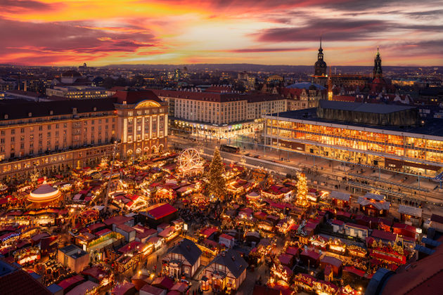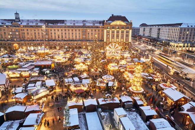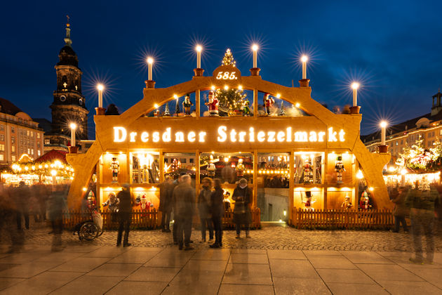 Auf dem Dresdner Altmarkt findet 2025 zum 591. Mal der überregional bekannte Striezelmarkt statt. Ein buntes Treiben empfängt die Besucher des Marktes. Überall kann die berühmte sächsische Handwerkskunst, wie das Töpferhandwerk oder das Stollenbacken, bewundert werden. Die erzgebirgische Volkskunst beruht auf einer jahrhundertealten Tradition und dürfte das Interesse vieler Weihnachtsmarktgäste wecken. Ein besonderes Wahrzeichen ist die 14,62 Meter hohe Stufenpyramide, die es bereits im Jahr 1999 ins Guinness Buch der Rekorde schaffte. Der begehbare Schwibbogen ist auch in diesem Jahr wieder aufgebaut und heißt die zahlreichen Besucher herzlich willkommen. Großer Beliebtheit erfreuen sich auch die Familienthemenhäuser vom Wichtelkino bis zur Weihnachtsbäckerei. Jährlich pilgern ca. 2,5 Millionen Gäste in die Altstadt, um dieses weihnachtliche Event mitzuerleben. Die Tradition des Dresdner Striezelmarktes reicht bis in das Jahr 1435 zurück. Unverkennbar ist die Verbindung des berühmten Dresdner Stollens (Striezel) mit der Einzigartigkeit dieses Weihnachtsmarktes. Die Stollenprozession durch die Dresdner Altstadt ist alljährlich ein besonderes Ereignis. Unmittelbar auf die Prozession folgt der ebenso traditionelle Riesenstollenanschnitt. Neben den traditionellen Genüssen finden Besucher des Striezelmarktes auch eine Vielzahl an traditionsreicher Kunst. So gibt es die berühmten Schwibbögen, Weihnachtspyramiden, Handgeschnitztes aus dem Erzgebirge, vogtländische Klöppelspitze, Räuchermännchen und andere Kleinartikel. Berühmt ist auch der Dresdner Pflaumentoffel, ein Glücksbringer aus Backpflaumen, der den kleinen Schlotfegerjungen nachgebildet ist, welche früher die Kamine reinigen mussten. Lassen Sie sich den Besuch des Striezelmarktes in Dresden nicht entgehen. (© FuM)