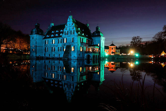 Am ersten Adventswochenende öffnen Baron und Baronin zu Knyphausen die Tore zum zauberhaften Schloss Bodelschwingh in Dortmund zum Erlebnismarkt "Weihnachtsflair auf Schloss Bodelschwingh". Der weitläufige Park des historischen Wasserschlosses verwandelt sich in einen stimmungsvollen Weihnachtsmarkt mitten im Ruhrgebiet. Vorburg und Park bieten Platz für rund 100 Aussteller:innen, die in weißen Pagoden eine Vielzahl von Schätzen für die Weihnachtszeit präsentieren. Das hochwertige Angebot reicht von traditionellen Familienunternehmen bis zu jungen Kreativen, die gemeinsam ein einzigartiges Erlebnis für Besucher schaffen. Ein besinnliches Rahmenprogramm mit weihnachtlicher Trompetenmusik, Stelzenengeln und dem Weihnachtsmann im Pferdeschlitten begleitet die Gäste durch den festlich illuminierten Schlosspark. Die Besucher erwartet nicht nur ein Schlemmerparadies, sondern auch ein Wintermärchen mit Fackelfeuern, erleuchteten Schlosstürmen und dem malerischen Spiegelbild im abendlichen Wasser. Abseits hektischer Innenstädte bietet der Weihnachtsmarkt "Weihnachtsflair auf Schloss Bodelschwingh" eine perfekte Alternative für die ganze Familie in der wohl schönsten Zeit des Jahres. Hochwertiges Catering und Winzerglühwein laden zum Verweilen ein, während die besondere Atmosphäre des Schlosses eine herrliche Winterreise verspricht. (© FuM)
