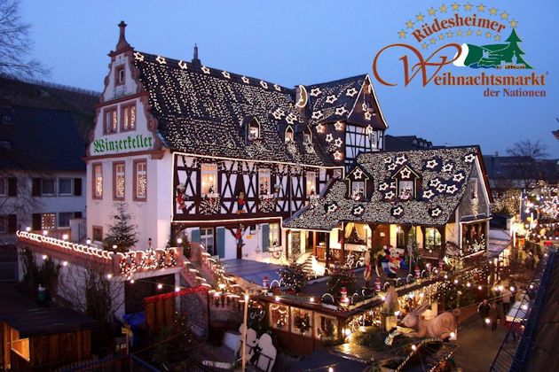 Der Weihnachtsmarkt der Nationen in Rüdesheim am Rhein öffnet in diesem Jahr in der Rüdesheimer Altstadt seine Pforten. Die kleine Stadt im Rheingau bietet internationales weihnachtliches Flair. An über 100 festlich geschmückten Ständen finden die Besucher weihnachtliche Produkte wie Krippen, Dekorationen, Schwibbögen und Waren aus über 12 Nationen. Kerzenzieher, Schmuck- und Puppenmacher, Holzschnitzer, Glas- und Brandmaler werden vor Ort sein und Kunsthandwerk nach den Wünschen der Besucher anfertigen. Die festliche Marktatmosphäre inmitten der Rüdesheimer Altstadt lädt zum Bummeln und Shoppen ein. Es werden Ihnen verschiedene weihnachtliche Konzerte, Aufführungen und Festumzüge an den Adventswochenenden geboten. Besonders sehenswert ist das größte bundesdeutsche Krippengelände mit lebensgroßen Figuren. Die Kinder können sich auf das Ponyreiten, den Streichelzoo, das Rüdesheimer Christkind, den Nikolaus sowie das Wichtelspiel und den Adventskalender auf dem Seilbahnvorplatz freuen. Für das leibliche Wohl ist mit kulinarischen Spezialitäten wie Rheingauer Festgerichte, Rüdesheimer Kaffee, Glühwein und heißer Saft gesorgt. (© FuM)
