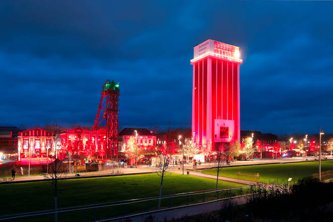 Der Weihnachtsmarkt im Zechenpark in Kamp-Lintfort findet 2025 zum 5. Mal statt. Für zwei verlängerte Adventswochenenden bildet der Quartiersplatz im Zechenpark den Schauplatz für diesen Weihnachtsmarkt. Das festlich illuminierte Gebäude sowie Förderturm und Fördergerüst sorgen für ein besonderes Flair. Punkten will der Weihnachtsmarkt im Zechenpark mit dem vielfältigen Angebot der Händler, einem hochwertigen gastronomischen Angebot sowie einem musikalischen Bühnenprogramm. Angeboten werden auch Führungen auf dem Förderturm, von wo aus man die Aussicht über den Niederrhein bis ins Ruhrgebiet bestaunen kann. Der Weihnachtsmarkt im Zechenpark in Kamp-Lintfort fällt in der Regel auf die ersten beiden Adventswochenenden. (© FuM)
