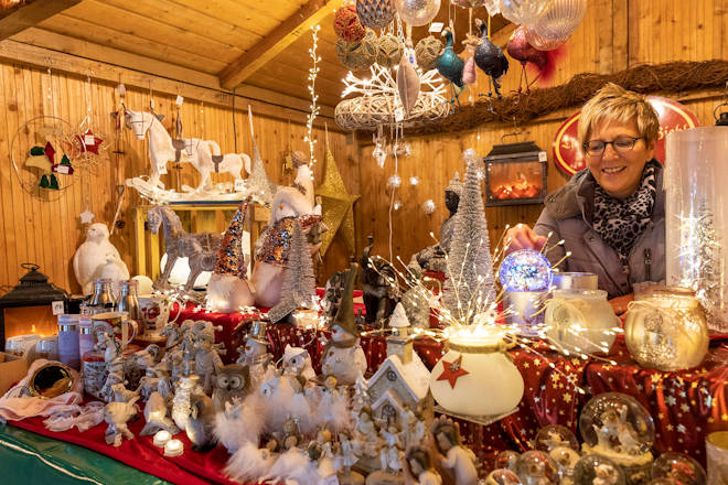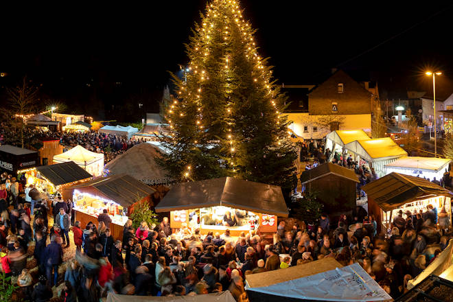 Bad Marienberg lädt am 1. Adventswochenende zu einem traditionellen Weihnachtsmarkt in die Innenstadt ein. Der neue Marktplatz verwandelt sich dazu in ein Weihnachtsdorf. An den festlich geschmückten Holzhütten werden weihnachtliche Waren, darunter die beliebten Weihnachtskrippen aus dem Sauerland, angeboten. Die kleinen Besucher dürfen sich auf ein Kinderkarussell freuen. Zum Rahmenprogramm gehören musikalische Darbietungen von Musikkapellen, Bläsergruppen und einer Live-Band. Am ersten Advent beteiligen sich die örtlichen Einzelhändler in der Regel mit einem verkaufsoffenen Sonntag am Weihnachtsmarkt in Bad Marienberg. (© FuM)