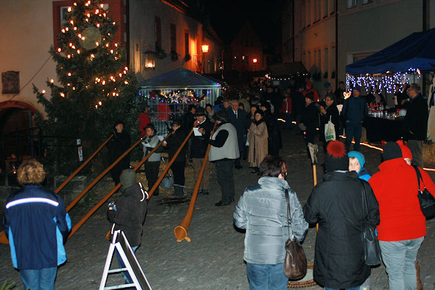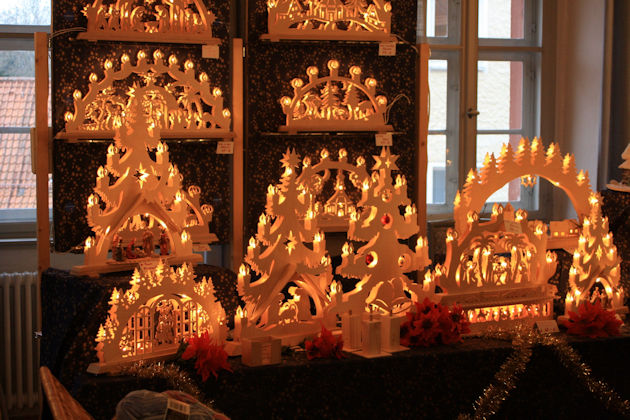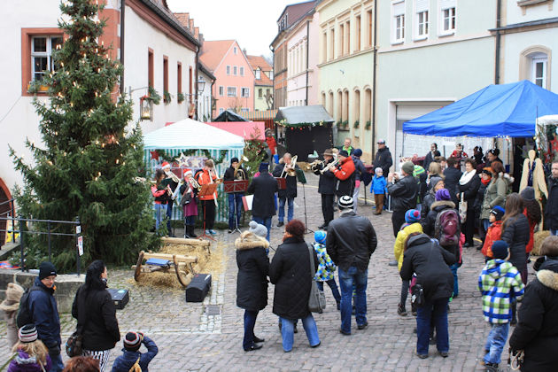 Der Weihnachtsmarkt in Creußen wird in diesem Jahr wieder in Form einer "Fränkischen Hausflurweihnacht" gestaltet. In den großen historischen Hauseingängen in der Altstadt werden dazu Stände mit weihnachtlichen wie auch kulinarischen Angeboten aufgebaut. Auch das Alte Rathaus aus dem 15. Jahrhundert mit seinen "Brot- und Fleischbänke" ist mit einbezogen. Abgerundet wird die "Fränkische Hausflurweihnacht" in Creußen durch ein kulturelles Programm. Höhepunkt am Samstagabend ist der Auftritt der Bläsergruppe "Speichersdorfer Fichtenhornbläser" vor dem Alten Rathaus. Die Kinder können sich am Sonntagnachmittag auf den Nikolaus freuen, der kleine Geschenke verteilt. Anschließend gestalten kirchliche Gruppen das "Singen unterm Weihnachtsbaum" auf dem Marktplatz. Der Weihnachtsmarkt in Creußen findet immer am ersten Adventswochenende statt. (© FuM)