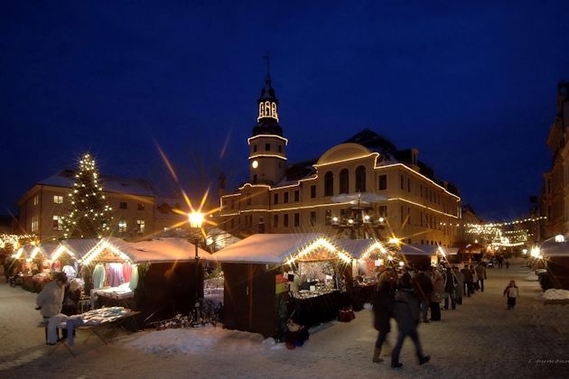 Der Weihnachtsmarkt in Crimmitschau startet bereits eine knappe Woche vor der eigentlichen Eröffnung mit einem besonderen Event. Am Samstag vor dem 1. Advent wird es gegen 17 Uhr das Pyramidenanschieben geben. Gegen 18 Uhr wird mit einem "Hau-Ruck" aller Besucher die Marktpyramide in Bewegung gesetzt. Am Freitag vor dem 2. Advent startet dann der eigentliche, dreitägige Crimmitschauer Weihnachtsmarkt. An den etwa 40 geschmückten Weihnachtsmarkthütten wird ein breites Sortiment von Weihnachtsbaumschmuck über Schnitzereien bis hin zu Geschenkartikeln angeboten. Natürlich dürfen auch die kulinarischen Spezialitäten nicht fehlen. Ein abwechslungsreiches Rahmenprogramm rundet den Weihnachtsmarkt in Crimmitschau ab. (© FuM)