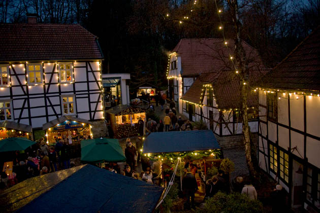 Der Weihnachtsmarkt der Städtischen Museen Iserlohn verwandelt das Historische Fabrikendorf am Baarbach am 2. und 3. Adventswochenenden in ein festlich geschmücktes Winterparadies. Etwa 50 liebevoll gestaltete Stände präsentieren Kunsthandwerk, Naturprodukte, feine Handarbeiten, modernes Design und künstlerische Unikate. Historisches Handwerk wie Glasblasen, Seilerei, Drechseln und die traditionsreiche Haarnadelfertigung wird live vorgeführt. Kulinarische Vielfalt, das neue Nadelmuseum, geöffnete Künstlerateliers sowie musikalische Darbietungen von Chören und Blechbläsern in der Abenddämmerung machen den Besuch zu einem besonderen Erlebnis. (© FuM)
