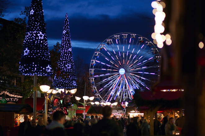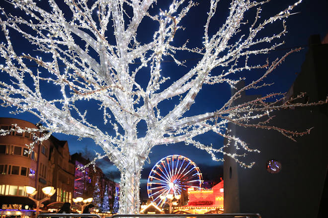 Der Duisburger Weihnachtsmarkt an der Königsstraße kann auf eine lange Tradition zurückblicken. Jedes Jahr verwandelt sich der Boulevard entlang der Königstraße, Kuhstraße und Düsseldorfer Straße sowie am Münzplatz in eine Weihnachtsmeile. Unzählige Weihnachtstannen und die Lichterketten in den Alleebäumen gehören zu den Erkennungszeichen des Weihnachtsmarktes in Duisburg. An über 100 festlich geschmückten Buden bieten die Markthändler ein breites Sortiment von Geschenkartikel über Kunsthandwerk bis zu kulinarischen Spezialitäten an. So sind Glas- und Keramikarbeiten oder Holzspielzeug genauso vertreten wie Reibekuchen, herzhafte Bratwurst, Weihnachtsgebäck und gebrannte Mandeln. Highlights wie die große Almhütte, die Glühweinpyramide aus dem Erzgebirge oder das Glühweinschiff dürfen auch in diesem Jahr auf dem Duisburger Weihnachtsmarkt nicht fehlen. Und was wäre der Duisburger Weihnachtsmarkt ohne das Riesenrad, welches nun auch schon seit Jahren ein fester Bestandteil des Duisburger Weihnachtsmarktes ist. Von oben hat man einen herrlichen Überblick über den gesamten Weihnachtsmarkt. Aufgebaut wird auch wieder die 400 Quadratmeter große Eisbahn der Stadtwerke Duisburg. Bei "Eislaufen unter freiem Himmel" ist Winterspaß für die ganze Familie garantiert. Neben der Eisbahn erwartet die Besucher auch ein buntes Rahmenprogramm. Am 4. Advent (21.12.2025) beteiligen sich die Einzelhändler der Duisburger City mit einem verkaufsoffenen Sonntag von 13 bis 18 Uhr am Duisburger Weihnachtsmarkt. Nach einer kleinen Verschnaufpause an Heiligabend und am 1. Weihnachtsfeiertag (beide Tage geschlossen) geht der Weihnachtsmarkt in Duisburg dann noch bis zum 30. Dezember weiter. So wird auch der Einkaufsbummel in der City "zwischen den Feiertagen" zum Erlebnis. (© FuM)
