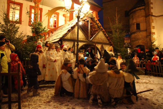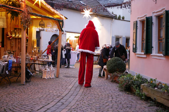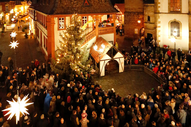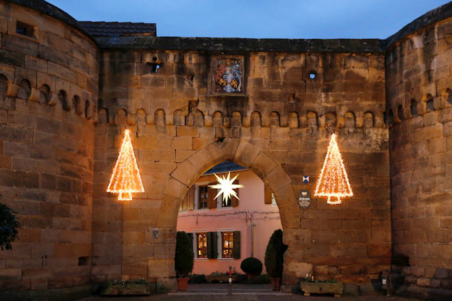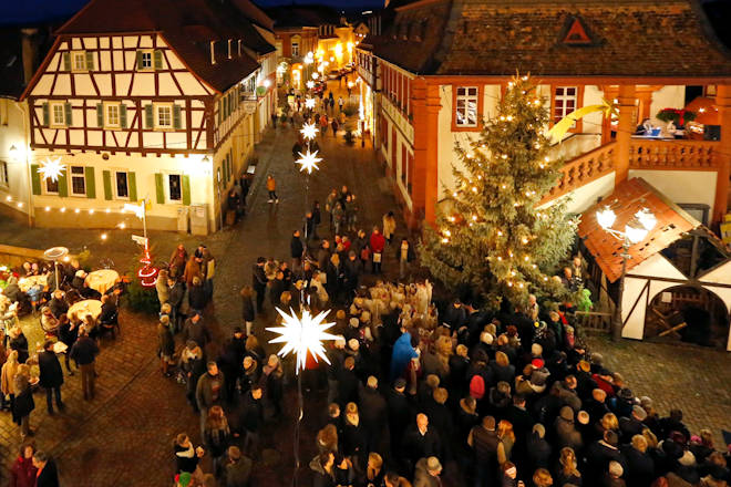 Zum Weihnachtsmarkt in Freinsheim erstrahlt die mittelalterliche Kulisse der Altstadt in festlichem Glanze. An allen vier Adventswochenenden öffnen die kleinen Fachwerkhütten hinter der evangelischen Kirche und entlang der Herrenstraße. Kunsthandwerker stellen ihre Exponate im Retzerpark aus. Bestandteil des Weihnachtsmarktes bilden auch die historischen Innenräume von Kelterhaus und Remise, wo filigraner Schmuck, Dekoartikel, Glaskunst, Keramik und Schnitzobjekte aus dem Erzgebirge angeboten werden. Süße und herzhafte Leckereien sowie Glühwein aus Freinsheimer Weinen, Kinderpunsch und Met sorgen für das leibliche Wohl der Besucher auf dem Weihnachtsmarkt in Freinsheim. Am ersten Advent beteiligen sich die örtlichen Einzelhändler mit einem verkaufsoffenen Sonntag am Weihnachtsmarkt. Zum Rahmenprogramm gehören die Weihnachtsgeschichte in Pfälzer Mundart (samstags und sonntags um 17:00 Uhr), romantische Stadtführungen mit Laternen (samstags um 17:45 Uhr, 5 Euro), der Bücherflohmarkt der Stadtbücherei sowie die Krippenausstellung an allen vier Adventwochenenden im Kirchturm der evangelischen Kirche. Die Kinder dürfen sich auf den Besuch des Weihnachtsmanns (freitags um 18:30 Uhr und sonntags um 15:00 Uhr im Retzerpark) sowie ein Karussell freuen. (© FuM)