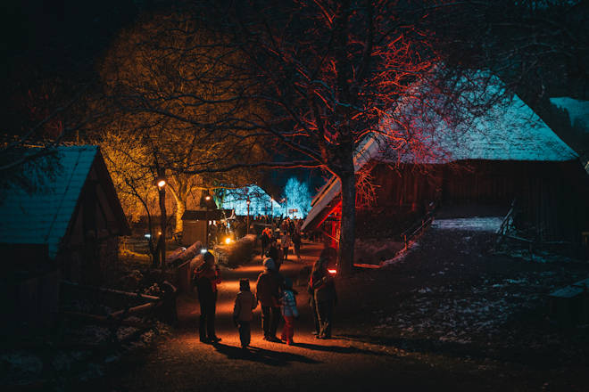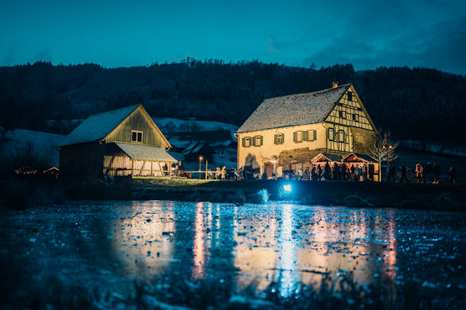 Der Weihnachtsmarkt in Gutach (Schwarzwaldbahn) öffnet wieder im stimmungsvoll beleuchteten Ambiente der historischen Schwarzwaldhöfe des Schwarzwälder Freilichtmuseums Vogtsbauernhof in Gutach. Rund 40 liebevoll gestaltete Hütten und Stände bieten traditionelles Handwerk und heimische Produkte an. Hier findet man originelle Geschenkideen und kulinarische Köstlichkeiten. Die imposanten, festlich beleuchteten Schwarzwaldhöfe fügen sich zu einem abendlichen Weihnachtsdorf zusammen, das zum gemütlichen Flanieren einlädt. Ein festliches musikalisches Rahmenprogramm begleitet die Besucher an allen drei Tagen. Die harmonischen Klänge tragen zur festlichen Stimmung bei und machen den Besuch zu einem unvergesslichen Erlebnis für die ganze Familie. Der Weihnachtsmarkt in Gutach (Schwarzwaldbahn) findet immer am dritten Adventswochenende statt. (© FuM)