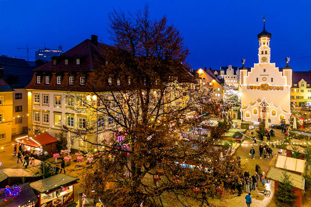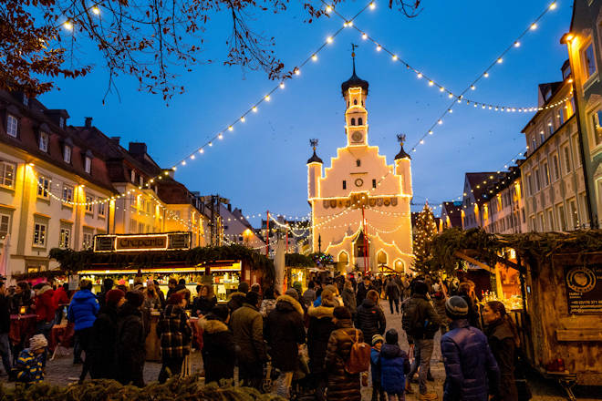 Der Weihnachtsmarkt in Kempten zählt zu den größten Weihnachtsmärkten im Allgäu. Vor der Kulisse der historischen Kemptener Altstadt verwandelt sich der Rathausplatz in eine kleine Budenstadt. An den rustikalen Holzhütten finden die Besucher ein breites Angebot an Geschenkartikeln und Weihnachtsdekoration. Für das leibliche Wohl der Weihnachtsmarkt-Besucher ist mit Früchtepunsch, Bratwurst, Lebkuchen, Crêpes und vielen weiteren Leckereien gesorgt. Für Krippenzauber sorgen die Zirbenholz-Krippe und der Krippenweg des Bildhauers Robert Liebenstein. Ein musikalisches Rahmenprogramm mit Alphornbläsern, Musikkapellen und Chöre aus Kempten und Umgebung rundet den Weihnachtsmarkt in Kempten ab. Für die kleinen Besucher gibt es im Kinderzelt Mitmachaktionen. (© FuM)