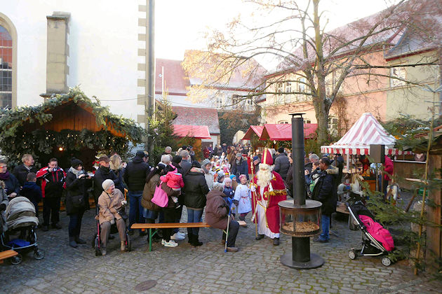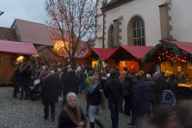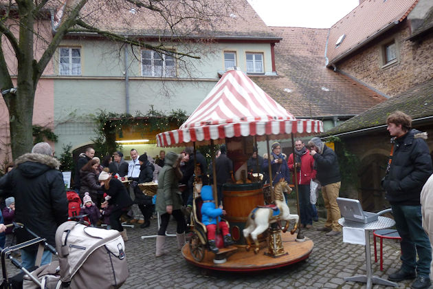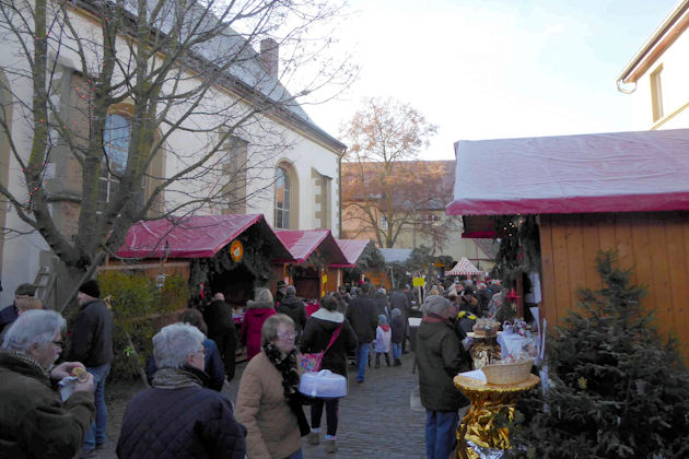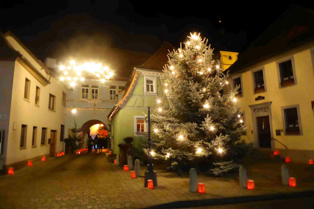 Das Gelände rund um die alte Kirchenburg in Kleinlangheim verwandelt sich zur Vorweihnachtszeit in einen festlichen Weihnachtsmarkt. Zwei Tage voller Winterzauber und Weihnachtsgefühle erleben die Besucher des Kleinlangheimer Weihnachtsmarktes. Die romantische Stimmung des Events sorgt für überregionales Aufsehen. Örtliche Vereine und Selbstvermarkter bieten an ihren Ständen nicht nur in Handarbeit gefertigte Geschenkartikel und weihnachtliche Dekoration an, sondern auch kulinarische Leckerbissen von altfränkischer Bratwurst über Suppen bis zu Heißgetränken an. Die kleinen Besucher können sich am Sonntag auf den Besuch vom Nikolaus freuen. Der Weihnachtsmarkt in Kleinlangheim findet jedes Jahr am 2. Adventswochenende statt. (© FuM)