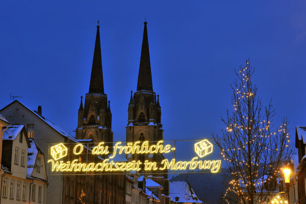 Der Weihnachtsmarkt rund um die Elisabethkirche ist einer der beiden Marburger Weihnachtsmärkte, welche am Freitagabend vor dem ersten Advent mit einer bunt erleuchteten Einkaufsnacht starten. Während der Marburger Adventsmarkt eher einen Treffpunkt mit Gastronomieständen darstellt, bauen rund um die Elisabethkirche die Markthändler ihre Stände auf. Geschenkartikel wie Korbwaren, Keramik, Ton und Spielwaren werden genauso angeboten wie Weihnachtsdekoration. Düfte von Anis bis Zimt verraten, dass auch hier weihnachtliche Spezialitäten zu haben sind. Ein abwechslungsreiches Begleitprogramm rundet den Weihnachtsmarkt rund um die Elisabethkirche ab. Zum vorweihnachtlichen Angebot in Marburg gehören neben den Weihnachtsmärkten auch der Märchenwald am Steinweg sowie der Eispalast am AquaMar. (© FuM)