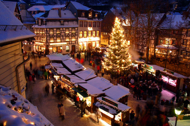 Mit Lichterbäumen und Girlanden in allen Straßen bereitet der Monschauer Weihnachtsmarkt seinen Gästen an allen vier Adventswochenenden einen wirklich zauberhaften Empfang. In den geschmückten Holzbuden wird ausschließlich weihnachtliche Ware angeboten. Von Holzspielzeug bis zu handgemachten Weihnachtsdekorationen ist sowohl für die kleinen als auch für die großen Besucher etwas dabei. Die Kinder dürfen sich auf dem Weihnachtsmarkt in Monschau auf den Besuch vom Nikolaus freuen. Fester Bestandteil beim Monschauer Weihnachtsmarkt sind auch die Auftritte der Turmbläser auf dem Marktplatz an allen Veranstaltungstagen. (© FuM)