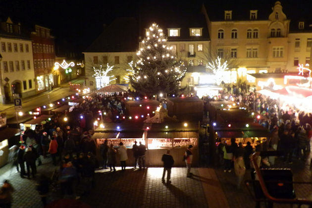 Der Weihnachtsmarkt in Mügeln, einer Kleinstadt im Südosten des Landkreises Nordsachsen, findet traditionell auf dem Marktplatz statt. Eröffnet wird der Markt am Samstag mit dem traditionellen Stollenanschnitt. An zahlreichen Verkaufsständen werden weihnachtliche Waren, Geschenkartikel und kulinarische Leckereien angeboten. Natürlich kommt auch der Weihnachtsmann zu Besuch und verteilt zusammen mit seinem Engel kleine Geschenke an die Kinder. Ein weihnachtliches Programm rundet den Weihnachtsmarkt in Mügeln ab. Der Termin für den Weihnachtsmarkt in Mügeln fällt in der Regel auf das erste Adventswochenende. (© FuM)