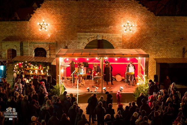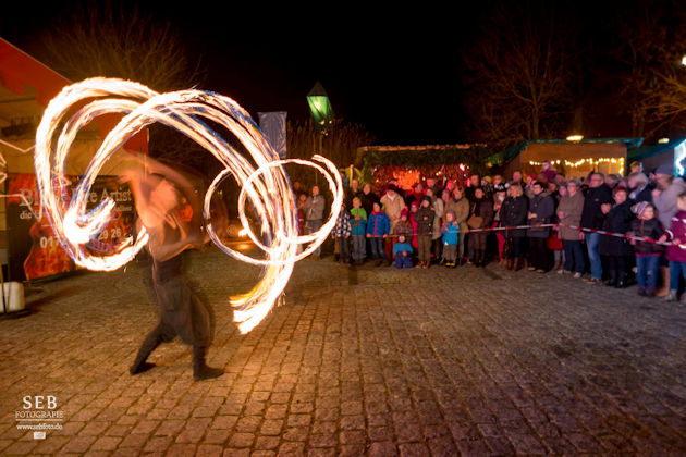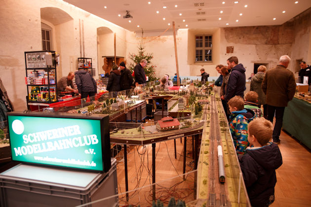 Zum Weihnachtsmarkt auf der Burg Neustadt-Glewe herrscht im Burginnenhof, auf dem Burgvorplatz wie auch auf drei Etagen in der Burg reges Markttreiben. Damit bietet der Neustädter Weihnachtsmarkt beste Gelegenheit, um Weihnachtsgeschenke zu kaufen. Für die Kinder gibt es eine Modellbahn-Ausstellung sowie die Kreativwerkstatt mit einer Vielzahl an Mitmachangeboten. Darüber hinaus dürfen sich die großen und kleinen Weihnachtsmarktbesucher auf handgemachte Musik, Feuershows, Weihnachtszauberei und Gaukelei freuen. (© FuM)