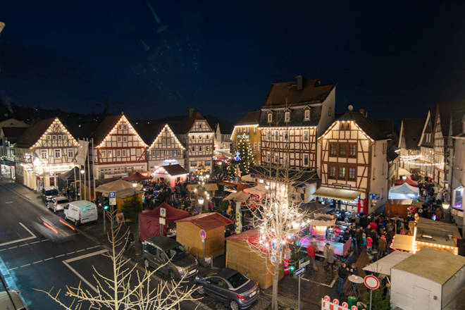Der Weihnachtsmarkt in Nidda öffnet auch in diesem Jahr rund um den historischen Marktplatz der Stadt in der hessischen Wetterau seine Pforten. Zahlreiche Markthändler laden die Besucher zum Sehen, Staunen, Schlemmen und Genießen ein. Höhepunkt sind eine lebende Krippe und die Weihnachtsverlosung. Ein abwechslungsreiches Programm mit weihnachtlichen Liedern rundet den Weihnachtsmarkt ab. Der Weihnachtsmarkt in Nidda findet in der Regel am ersten Adventswochenende statt. (© FuM)