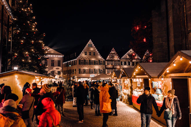 In der historischen Innenstadt von Öhringen, im fränkisch geprägten Nordosten von Baden-Württemberg, erstrahlt zur Adventszeit der Weihnachtsmarkt in vollem Glanz. Unter dem Motto "Winter, Wunder, Weihnachtsglanz" öffnet dieser zauberhafte Markt seine Tore an den ersten drei Adventswochenenden und lädt Besucher zu einem unvergesslichen vorweihnachtlichen Erlebnis ein. Die Große Kreisstadt Öhringen verzaubert ihre Gäste mit stimmungsvoller Beleuchtung und festlich geschmückten Marktständen, die eine breite Palette von Handwerkskunst und Geschenkartikeln bieten. Hier findet man mit Liebe gefertigte Unikate und originelle Geschenkideen für die Lieben. Die kulinarischen Köstlichkeiten reichen von duftendem Glühwein bis zur berühmten Hohenloher Bratwurst, die Gaumenfreuden für jeden Geschmack versprechen. Ein besonderes Highlight des Öhringer Weihnachtsmarktes ist das beliebte Bähnle auf dem Marktplatz. Die kleine Bahn nimmt die Besucher mit auf eine gemütliche Rundfahrt und trägt so zur besinnlichen Atmosphäre bei. (© FuM)