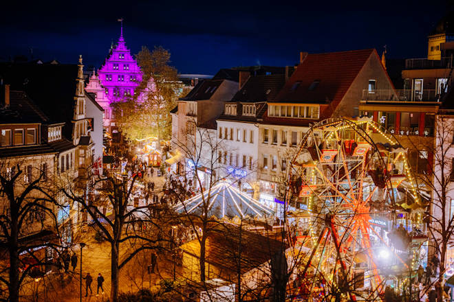Der Weihnachtsmarkt in Paderborn erstrahlt auch dieses Jahr wieder in festlichem Glanz und lädt Einheimische und Besucher dazu ein, die Vorfreude auf die Weihnachtszeit zu genießen. Dom- und Marktplatz sowie die Fußgängerzonen werden in eine zauberhafte Atmosphäre gehüllt, die zum Bummeln, Schlemmen und Staunen einlädt. Mit rund 80 Ständen bietet der Markt eine breite Palette von kulinarischen Köstlichkeiten, darunter traditionelle Weihnachtsleckereien, aber auch eine beeindruckende Auswahl an Kunsthandwerk, weihnachtlichen Dekoartikeln und Spielzeug. Hier findet jeder das passende Geschenk oder das eine oder andere Schmuckstück für die festliche Jahreszeit. Ein optischer Höhepunkt des Weihnachtsmarktes in Paderborn ist zweifellos die beeindruckende Weihnachtspyramide auf dem Marktplatz. Mit einer Höhe von etwa 20 Metern zählt sie zu den größten begehbaren Weihnachtspyramiden in der Region. Die Pyramide, im charmanten westfälischen Fachwerkstil aus Echtholz gefertigt, begeistert die Besucher mit sechs Ebenen. Die unteren beiden Ebenen sind begehbar, während sich die handgeschnitzten Weihnachtsfiguren auf den vier oberen Ebenen drehen. Der Höhepunkt bildet die Kupferspitze mit überdimensionalen, beleuchteten und beweglichen Flügeln. Für eine nostalgische Zeitreise sorgen das über hundert Jahre alte Paderborner Pferdekarussell und das Paderborner Riesenrad auf dem Marienplatz. Von hier aus hat man einen einzigartigen Blick auf das Rathaus, das sich in der Vorweihnachtszeit erneut in den größten Adventskalender der Region verwandelt. Jeden Tag wird ein Fenster in der prächtigen Weserrenaissance-Fassade geöffnet, um eines der 24 von Kindern der Paderborner Grundschulen gemalten weihnachtlichen Motive zu enthüllen. Der Weihnachtsmarkt in Paderborn bietet somit ein umfassendes und vielseitiges Erlebnis für die ganze Familie. (© FuM)