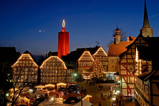 Der Weihnachtsmarkt in Schlitz trägt den Beinamen "Schlitzer Burgenweihnacht". Schon von weitem zu erkennen ist die wohl größte Weihnachtskerze der Welt. Rote Leinenbahnen aus den Schlitzer Webereien und unzählige Lichter verwandeln den Bergfried der Hinterburg schon seit über 30 Jahren in eine Kerze und damit zum Wahrzeichen des Schlitzer Weihnachtsmarktes. Nicht umsonst sind die Schlitzer Bürger stolz auf dieses Gebilde, denn damit steht die Stadt sogar im Guinnessbuch der Rekorde. Letzteres wiederum zieht Besucher aus der ganzen Welt zur Schlitzer Burgenweihnacht. Auf dem Marktplatz erwartet die Besucher eine Budenstadt. Regionale Spezialitäten wie Krautwurst, Kesselgulasch oder der Original Schlitzer Hexentrunk stehen dabei im Mittelpunkt. Der Duft von Bratwurst und Glühwein verrät den Besuchern, wo Sie ihren kleinen Hunger stillen können. Ein vorweihnachtliches Programm mit viel Live-Musik, Chorgesang, Kinderanimation und Verkaufsausstellungen runden den Weihnachtsmarkt in Schlitz ab. Die "Schlitzer Burgenweihnacht" findet an allen vier Adventswochenenden Samstag und Sonntag statt. Am 2. Wochenende lädt der Weihnachtsmarkt am Freitag zu einem "Glühweinabend" ein. (© FuM)