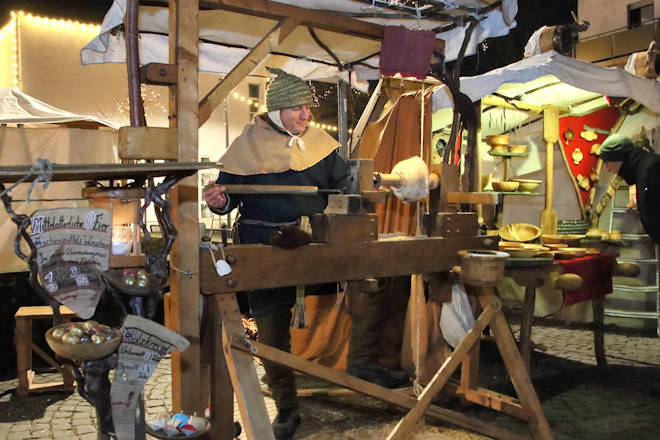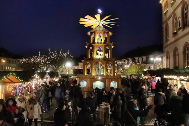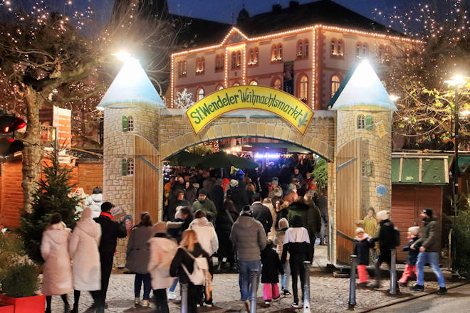 Zum Weihnachtsmarkt in St. Wendel werden in der Altstadt mehr als 160 liebevoll dekorierte Marktstände aufgebaut. Händler, Kunsthandwerker und Gastronomen bieten hier weihnachtliche Dekoration, Geschenkartikel, Kunsthandwerk und regionale Spezialitäten an. Die riesige Weihnachtspyramide mit kunstvoll geschnitzten Krippenfiguren, überdimensionale Nussknacker und Krippenweg sind die optischen Highlights des Weihnachtsmarktes. Heimische Chöre und Musiker sowie die Turmbläser gestalten das musikalische Rahmenprogramm. Die Kinder dürfen sich auf den Zwergenwald mit mehr als 300 zipfelbemützte, quicklebendige Kerlchen, eine schneebedeckte Rodelbahn, ein Nostalgiekarussell und die lebende Krippe freuen. Ein fester Bestandteil des Weihnachtsmarktes ist der Mittelaltermarkt mit seinen Krämern und Handwerkern. Mittelalterliche Gruppen zeigen den Besuchern das Lagerleben. Artisten, Magier, Gaukler und Possenreißer sorgen für Unterhaltung. Die Kinder dürfen sich auf Mitmachangebote freuen. Bevor der Weihnachtsmarkt schließt, begibt sich täglich um 19 Uhr der Nachtwächter mit Hellebarde, Horn und Laterne auf seine Runde. (© FuM)