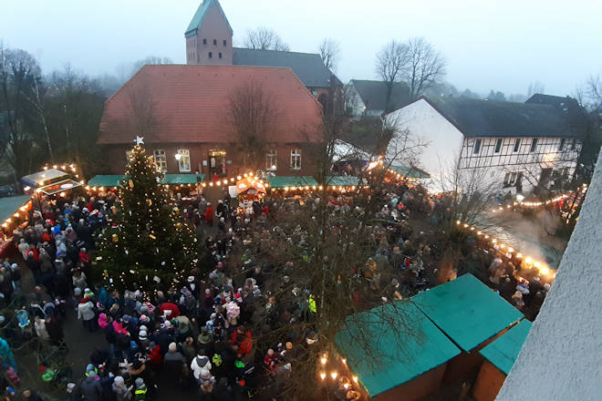 Der Weihnachtsmarkt in Stelle findet 2025 bereits zum 46. Mal statt. Los geht es schon am Freitagabend mit einem Warm-up in der Bücherei. Samstag und Sonntag werden dann auf dem Rathausplatz bis hin zum Gemeindebüro der ev. Kirche zahlreiche Aussteller in ihren geschmückten Holzverkaufshütten Waren anbieten. Neben Geschenkartikeln und weihnachtlicher Dekoration werden auch kulinarische Spezialitäten verkauft. Für das leibliche Wohl sorgt auch das Adventscafé im Gemeindebüro der ev. Kirche. Auch die Bücherei öffnet am Weihnachtsmarktwochenende. Ein Rahmenprogramm mit musikalischen Darbietungen rundet das Angebot zum Weihnachtsmarkt in Stelle ab. Die Kinder können sich jeweils gegen 16 Uhr auf den Besuch des Weihnachtsmannes freuen. (© FuM)