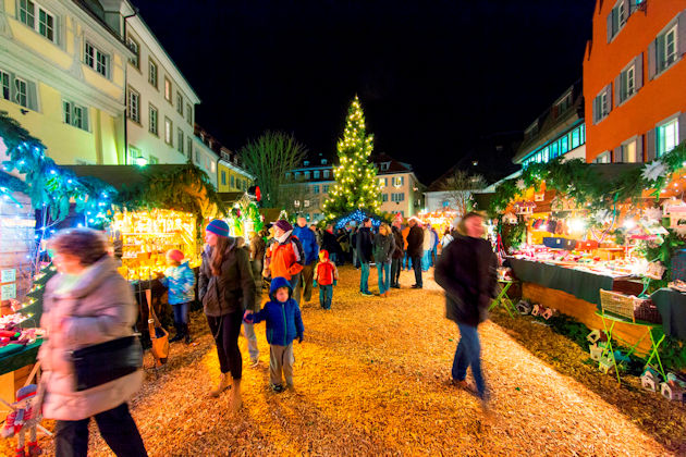 Zum Weihnachtsmarkt in Überlingen am Bodensee wird auf der Hofstatt ein kleines Weihnachtsdorf aufgebaut. Kunsthandwerker und Händler aus Überlingen und der Bodenseeregion verkaufen hier ihre liebevoll angefertigten Waren an attraktiv geschmückten Ständen. Für das leibliche Wohl gibt es weihnachtliche Spezialitäten. Ein abwechslungsreiches Rahmenprogramm mit musikalischen Darbietungen runden den Weihnachtsmarkt in Überlingen ab. Die Kinder dürfen sich auf das Weihnachtspostamt freuen. Organisiert wird der Überlinger Weihnachtsmarkt auf der Hofstatt von der Überlingen Marketing und Tourismus GmbH. Die Eislaufbahn "ÜB on Ice" am Landungsplatz und das Winter-Open-Air-Kino im Museumsgarten sind weitere Angebote im weihnachtlichen Überlingen. (© FuM)