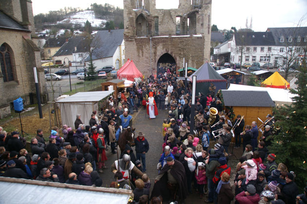 Der mittelalterliche Weihnachtsmarkt in Welschbillig öffnet seine Pforten in der historischen Burganlage. Im historischen Flair der Burg bieten zahlreiche Marktstände verschiedene Artikel an. Für die Unterhaltung der Besucher sorgen ein musikalisches Rahmenprogramm und atemberaubende Auftritte eines Feuerspuckers. Die Kinder dürfen sich zudem auf den Besuch des Nikolaus am Sonntagnachmittag und auf die geplanten Kutschfahrten durch den historischen Ortskern am Sonntag freuen. Der mittelalterliche Weihnachtsmarkt in Welschbillig wird organisiert vom Ritterorden Welschpilliche und fällt in der Regel auf das dritte Adventswochenende. (© FuM)