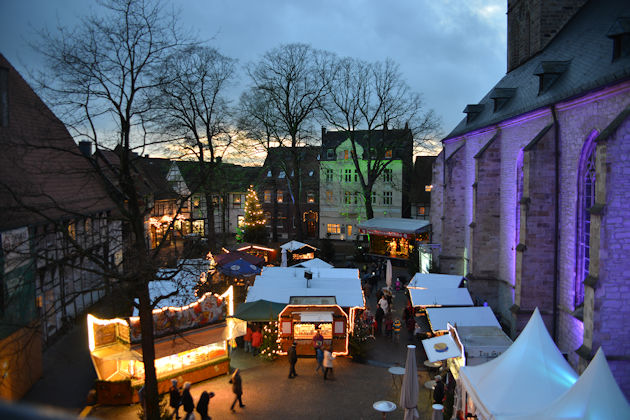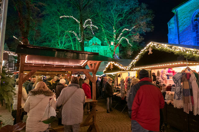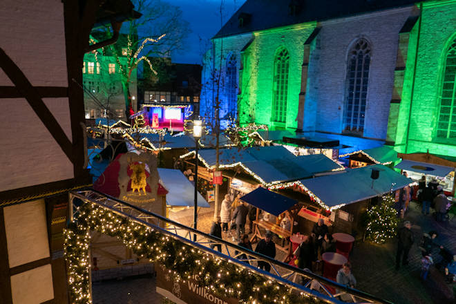 Der Weihnachtsmarkt in Werne findet auch in diesem Jahr auf dem Kirchplatz vor der historischen Kulisse der St. Christophorus Kirche statt. Besondere Lichteffekte sorgen dabei für eine einladende Atmosphäre. An etwa 20 Buden können die Besucher Handgemachtes und weihnachtliche Präsente erwerben sowie kulinarische Spezialitäten und Glühwein genießen. Die Kinder dürfen sich auf das Wolkenpostamt und die himmlische Bastelstube freuen. Abgerundet wird der Weihnachtsmarkt in Werne von einem täglichen Bühnenprogramm mit Aufführungen, Geschichten und musikalischen Darbietungen. (© FuM)