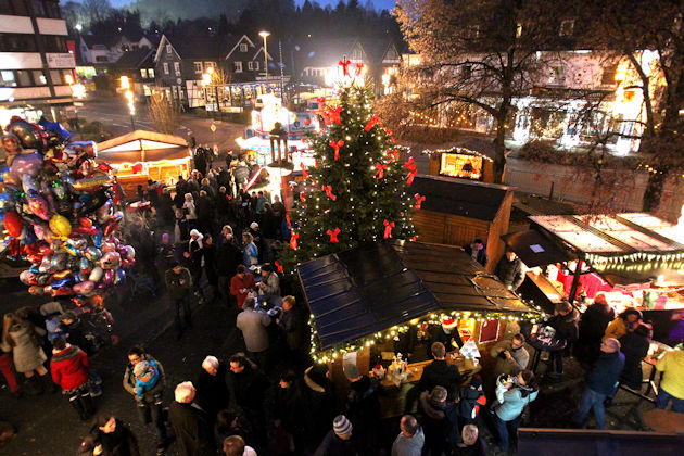 Der Weihnachtsmarkt in Wiehl findet 2025 bereits zum 41. Mal statt. Auf dem Rathausvorplatz sowie im alten Kurpark bauen die Händler und Gastronomen ihre Stände auf und bieten ein breites Angebot an Geschenkartikeln sowie kulinarischen Spezialitäten, darunter Hindenlanger Bergkäse und Glühweingelee, an. Das "Weihnachtshaus" im Rathaus beherbergt zeitgleich wieder den Kunsthandwerkermarkt. Die Kinder dürfen sich auf den Besuch des Nikolaus sowie die lebende Krippe freuen. Musikalische Programmpunkte runden den zweitägigen Wiehler Weihnachtsmarkt ab. Der Weihnachtsmarkt in Wiehl lädt immer am 2. Adventswochenende zum verweilen und bummeln ein. (© FuM)