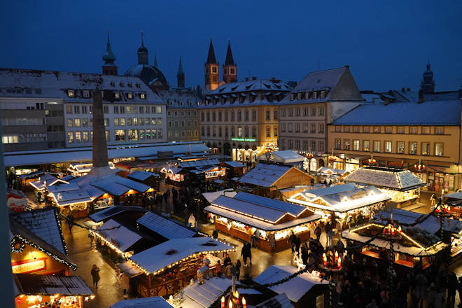 Zum Weihnachtsmarkt in Würzburg werden etwa 100 Buden und Verkaufsstände vor der historischen Kulisse von Marienkapelle und Falkenhaus aufgebaut. Angeboten werden hier Kunstgewerbe, Geschenkartikel und weihnachtliche Leckereien. Der Innenhof des Rathauses in der Rückermainstraße ist das Domizil des Künstler-Weihnachtsmarktes an allen vier Adventswochenenden (Samstag und Sonntag). Hier sind handgefertigter Weihnachtsschmuck, Kinderspielzeug, Tiffany-Glaskunst und Aquarelle die Renner. Nach dem Einkauf von Geschenken und Weihnachtsschmuck sollte man unbedingt noch von den angebotenen fränkischen Spezialitäten probieren. Der Weihnachtsmarkt in Würzburg wird abgerundet durch ein attraktives Rahmenprogramm. Neben Posaunenklängen von der Balustrade der Marienkapelle hört man überall weihnachtliche Musik. Der Würzburger Weihnachtsmarkt findet alljährlich ab dem Freitag vor dem 1. Advent bis zum 23. Dezember statt.