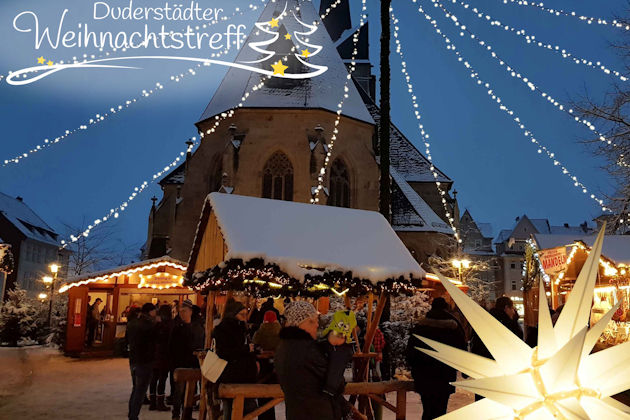 Als "Duderstädter Weihnachtstreff" findet der Weihnachtsmarkt in Duderstadt wieder statt. In der Marktstraße werden im Bereich der Unterkirche vor allem Gastronomiestände mit den typischen weihnachtlichen Leckereien, wie Glühwein, Würstchen oder gebrannte Mandeln zu finden sein. Großer Beliebtheit erfreut sich die "Wechselbude", an der wechselnde Aussteller ihre Produkte präsentieren. Hier können sich Einheimische wie Besucher inmitten des Duderstadter Stadtkerns mit seinen liebevoll restaurierten Fachwerkhäusern treffen oder zum Einkaufsbummel verabreden. Zum Rahmenprogramm gehören die Klänge der Adventsbläser sonntags gegen 18 Uhr. Großer Beliebtheit erfreut sich zum "Duderstädter Weihnachtstreff" auch die tägliche Tombola. Einen weiteren Höhepunkt stellt der Adventskalender im historischen Rathaus dar, wo jeden Tag ein neues Fenster beleuchtet ist. (© FuM)