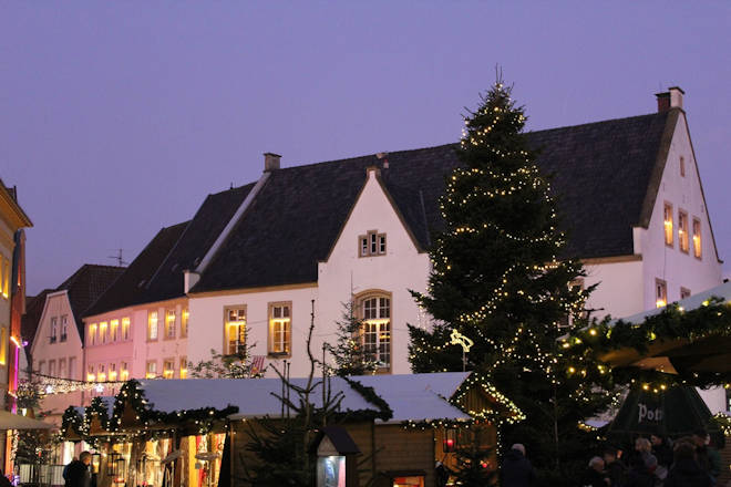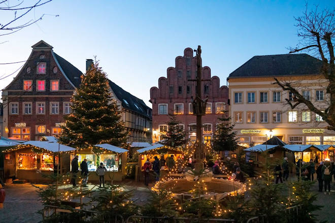 Der Weihnachtsmarkt in der Warendorfer Altstadt trägt den Namen "Warendorfer Weihnachtswäldchen". Die historischen Giebel der alten Bürgerhäuser am Marktplatz bilden die Kulisse für diesen besonderen Weihnachtsmarkt, der von einem kleinen Wald aus echten Tannen umsäumt wird. Das Warendorfer Weihnachtswäldchen in Warendorf hebt sich von den konsumorientierten Weihnachtsmärkten ab, denn hier stehen familienfreundliche Programmpunkte im Mittelpunkt. Angeboten werden attraktives Kunsthandwerk, ansprechender Weihnachtsschmuck und vorweihnachtliche Dekoration. Kulinarische Köstlichkeiten und Glühwein dürfen nicht fehlen. Die Kinder dürfen sich auf den Besuch vom Nikolaus, der den Weihnachtsmarkt mit seiner Kutsche am Nikolaustag besucht, Weihnachtsgeschichten im Lesepavillon, Stockbrotbacken und vieles mehr freuen. Auch das Rahmenprogramm kann sich sehen lassen. Höhepunkte sind die Eröffnung am Freitag vor dem 1. Advent, der Warendorfer Wintersonntag mit verkaufsoffenen Sonntag der Einzelhändler am 2. Advent sowie die Hüttengaudi am Samstag vor dem 3. Advent. Die Besucher haben die Möglichkeit, bei Kutschfahrten und Führungen das winterliche Warendorf in seiner ganzen Vielfalt kennenzulernen. Das gemütliche Weihnachtswäldchen befindet sich inmitten der festlich geschmückten Altstadt von Warendorf und bietet den perfekten Ausgangspunkt für einen entspannten Einkaufsbummel in der Vorweihnachtszeit. Nachdem man alle Geschenke besorgt hat, kann man sich auf eine wohlverdiente Pause in einem der zahlreichen Cafés oder Restaurants freuen. Die Altstadt ist bequem mit öffentlichen Verkehrsmitteln erreichbar, und für diejenigen, die mit dem Auto anreisen, stehen kostenlose Parkplätze in der Nähe der Altstadt auf der Linnenwiese zur Verfügung. (© FuM)