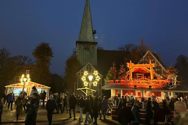 Der Weihnachtsmarkt in Hamburg-Bergedorf wird wieder NORDISCH, eben Bullerbü mit Funkeln und Glitzer. Die weihnachtlichen Hütten reihen sich von der Einkaufsstraße "Alte Holstenstraße" über den Kirchenvorplatz der "St.-Petri und Pauli-Kirche" bis zum Bergedorfer Schlossgarten. Geschenkartikel aus skandinavischen Ländern sowie landestypischer Gaumenfreude aus Dänemark, Norwegen und Schweden werden hier angeboten. Kulinarisch überzeugen Lussebulle und Köttbullar genauso wie Bratapfel-Glögg und alkoholfreier schwedischer Glühwein mit Rosinen und Mandeln. Auf der zentralen Bühne auf der Schlosswiese erklingt täglich Livemusik und auch das beliebte Adventssingen findet wieder statt. Die Kinder dürfen sich auf Angebote wie die "Villa Kunterbunt" mit ihrem Bastel- und Spielprogramm freuen. Dort können die kleinen Besucher sich auch mit dem Weihnachtsmann fotografieren lassen und ihre Wunschzettel abgeben. Als besonderes Highlight nimmt der Weihnachtsmarkt in Hamburg-Bergedorf 2025 das Lied "Leise rieselt der Schnee" wörtlich und lässt an verschiedenen Stellen Schnee vom Himmel rieseln. (© FuM)
